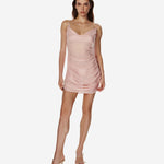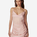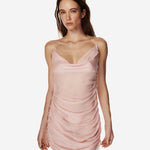 Міні-сукня з напівпрозорої тканини, драпірована по фігурі, з вирізом «водоспад» спереду та ззаду, а також тонкими зав’язками, які можна фіксувати різними способами.