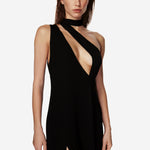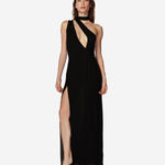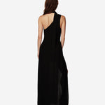 Довга сукня з крепової віскози зі схованою блискавкою збоку, розрізом на правій нозі та бретеллю на плечі, оздобленою шарфовою деталлю.